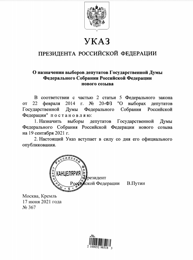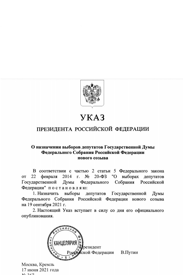 Президент Российской Федерации Владимир Путин 17 июня 2021 года подписал Указ «О назначении выборов депутатов Государственной Думы Федерального Собрания Российской Федерации нового созыва».