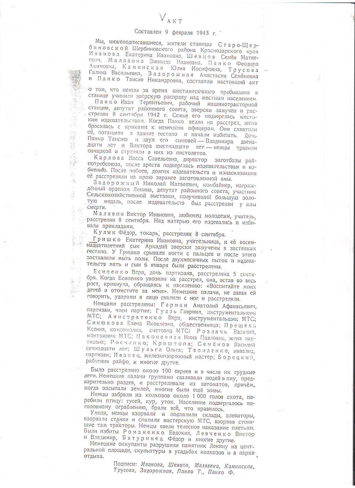 …В феврале 1943 года в станицу вошли войска Красной Армии. Из Староминского гестапо были перевезены трупы подпольщиков: учительницы Гришко Екатерины Ивановны и ее сына Аркадия, Германа Анатолия Афанасьевича, Вишняковой, Наконечной. На центральной площади (где сейчас памятник Ленину) мы собрались, чтобы попрощаться с этими людьми. На них были страшные следы пыток: выколоты глаза, сорваны ногти, обгоревшие ступни, раны на ребрах (наверное, подвешивали), на груди Аркадия Гришко была выжжена звезда и надпись «Я – партизан». Видимо люди умирали в страшных мучениях. Из них я хорошо знала А.А.Германа. Я очень сильно плакала, вспоминая, как он был добр со мной. Все эти люди были похоронены в братской могиле, в парке. На том месте сейчас расположен мемориал».