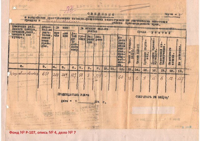 Перед приходом немецких войск по решению руководства района были уничтожены все документы органов власти. Райисполком возобновил свою деятельность лишь после освобождения района. По этой причине в архивном отделе муниципального образования Щербиновский район в настоящее время находятся на хранении документы районного исполкома лишь с февраля 1943 года. Таким образом, сохраненными оказались документы, содержащие сведения о периоде после освобождения района: 14 актов о расстреле мирных жителей Щербиновского района, в том числе и массовых, 43 акта о нанесенном ущербе предприятиям и колхозам Щербиновского района, 18 актов об ущербе и убытках колхозов Лиманского района, 868 актов об убытках, понесенных гражданами сел Ейское Укрепление, Екатериновка, Глафировка, Шабельское и Николаевка, 6 актов об ущербе, причиненном сельским советам Лиманского района, имеются акты об аресте и угоне жителей Лиманского района в Ейское гестапо. Согласно сведениям районного исполкома о преступлениях немецко-фашистских захватчиков по уничтожению советских граждан, в Щербиновском районе уничтожено: 631 человек, из них 510 евреев. Есть в этом документе отдельная графа: «детей - 139».