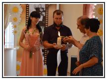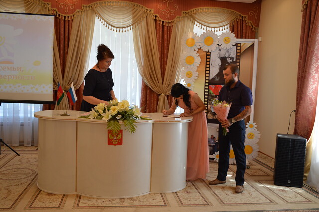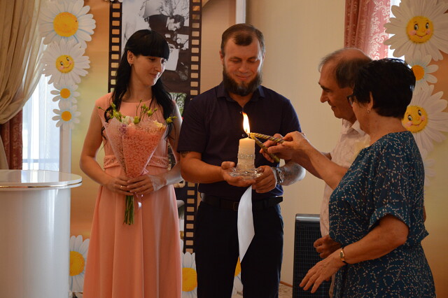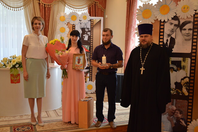 Сегодня в Отделе ЗАГС Щербиновского района прошло торжественное мероприятие, посвященное Дню семьи, любви и верности. Именно в этот день в Отделе ЗАГС зарегистрирован брак. Свои отношения решили узаконить Ветошкин Максим и Демьяненко Виктория. С этим прекрасным событием новобрачных поздравили исполняющий полномочия главы района Виктория Савина и настоятель храма «Покрова пресвятой Богородицы» станицы Старощербиновской, отец Василий. От золотых юбиляров Владимира Филипповича и Галины Ивановны Прокопенко Максим и Виктория получили частичку солнца - семейный очаг.