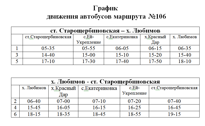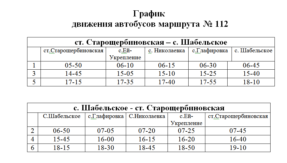 Уважаемые жители района публикуем график движения маршрутов № 106 и № 112. Напоминаем, что для муниципального маршрутного сообщения между с. Шабельское и ст. Старощербиновской по маршруту № 106 «ст. Старощербиновская – с. Шабельское» и № 112 «ст. Старощербиновская - х. Любимов» по результатам аукциона определен перевозчик. Осуществление перевозок запланировано с 6 сентября 2021 года после подписания контракта на осуществление регулярных перевозок пассажиров и багажа.