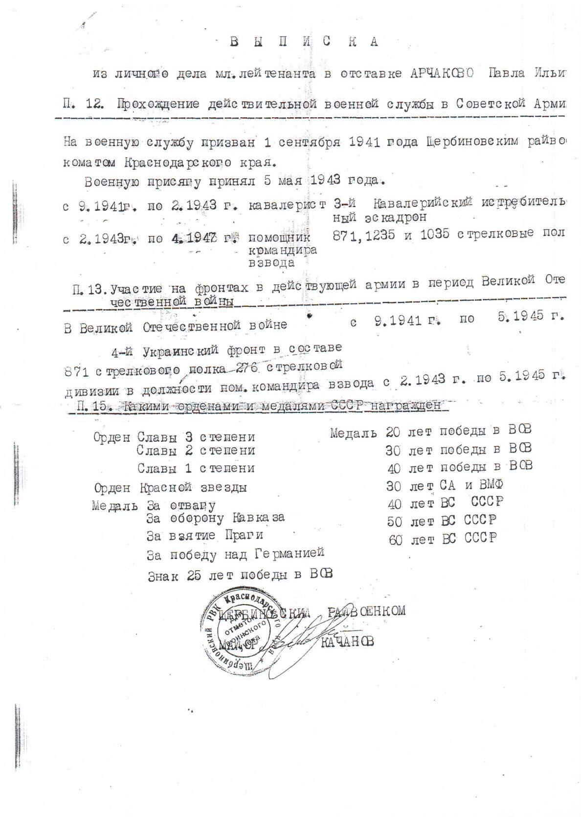 Из статьи А.Сергиенко «Полный кавалер ордена Славы», опубликованной в газете «Над Кубанью» (без даты): «…Когда в станицу Старощербиновскую 6 августа 1942 года входили немецкие оккупанты, кавалерийский истребительный батальон под напором врага отступал к Ейску. Казаки ехали мрачные, неразговорчивые, каждый думал об оставленных семьях, обо всем, что так было дорого сердцу. Павел Арчаков ехал рядом со своим другом Николаем Волошиным. Около шести суток батальон дрался с фашистами на подступах к Ейску, а затем, погрузившись на пароход, отбыл сначала к Темрюку, а потом к Новороссийску, где влился в состав 276-й стрелковой дивизии. Павел Арчаков стал разведчиком 871-го стрелкового полка… (ф.Р-107, оп.4, д.28, л.13)