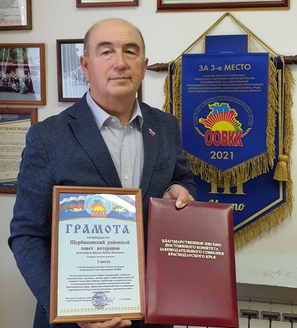Кроме этого, Благодарственным письмом Законодательного Собрания Краснодарского края за активное участие в подготовке и проведении мероприятий в рамках ежегодного краевого конкурса оборонно-массовой и военно- патриотисечкой работы памяти маршала Жукова Г.К. отмечен председатель Щербиновского районного Совета ветеранов Михаил Кряжов.