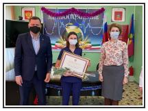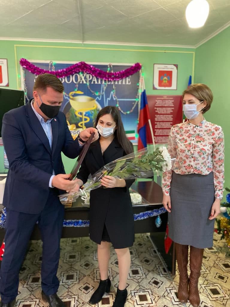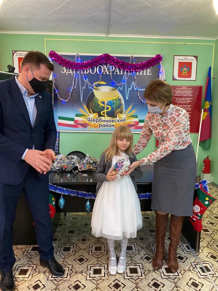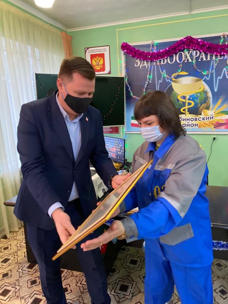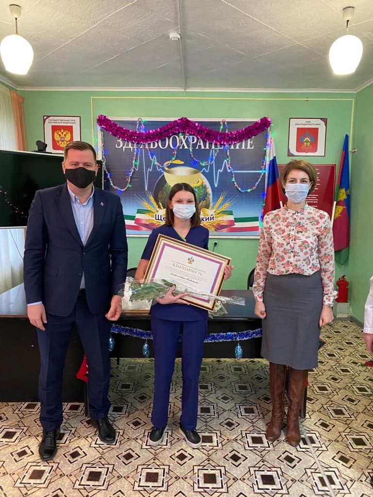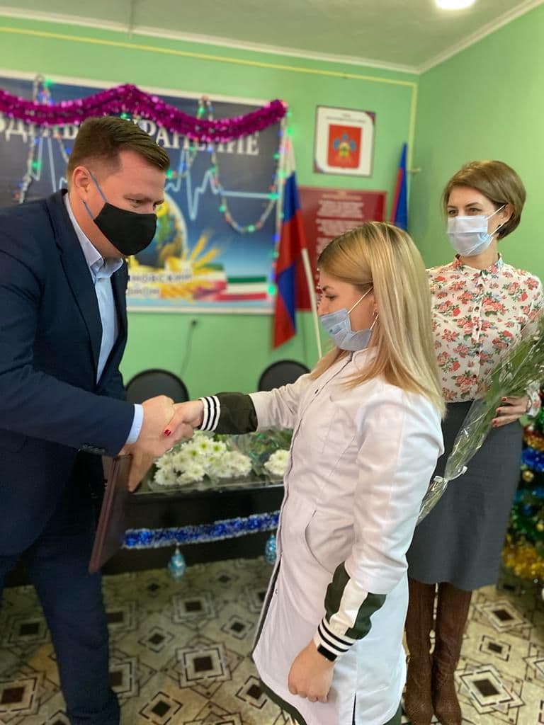 Сегодня исполняющий полномочия главы района Михаил Чернов и заместитель главы Виктория Савина наградили медицинских работников, работающих с больными коронавирусной инфекции. Михаил Николаевич и Виктория Александровна вручили за самоотверженный труд по предупреждению чрезвычайной ситуации и активную деятельность по охране здоровья граждан в рамках обеспечения санитарно-эпидемиологического благополучия населения в связи с распространением новой коронавирусной инфекции вручили медикам Почетные грамоты и Благодарности главы администрации (губернатора) Краснодарского края. Заслуженные награды были вручены Виктории Мальцевой, врачу-терапевту участковому терапевтического отделения поликлиники; Анне Гордиенко, фельдшеру кабинета неотложной помощи поликлиники; Ольге Джафаровой, врачу-терапевту участковому терапевтического отделения поликлиники; Светлане Герасюте, фельдшеру скорой медицинской помощи; Людмиле Головко, медицинской сестре участковой терапевтического отделения поликлиники; Алексею Курило, фельдшеру скорой медицинской помощи; Ларисе Зверевой, фельдшеру скорой медицинской помощи. Кроме этого, дети сотрудников, которые работают с больными коронавирусом, получили новогодние сладкие подарки.