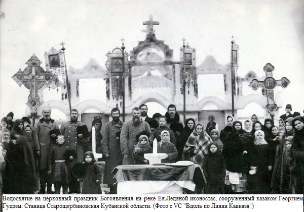 Интересные традиции казачества связаны с православным праздником Крещение. О том, как в старину щербиновские казаки праздновали этот день, имеются сведения в статье Михаила Вивчарь «Святки» (1991 г.): «…День перед последним новогодним праздником – Крещением – называют голодной кутьей. Почему голодная? В этот день с утра ничего нельзя было есть, пока не закончится служба в церкви и не принесут домой свяченой воды. Этой водой окропляли все помещения, над окнами и дверью, а также в хлевах, где стояла худоба, писали мелом кресты… До этого с утра хозяйка устанавливала макитру с кутьей на сене под иконой в святом углу. Когда садились все за стол, она подходила к макитре и говорила: «Мороз, мороз, иди к нам кутью есть. Не идешь, и не иди, не морозь ни гусят, ни телят, ни ягнят, ни другую живность. Иди к нам вечерять». Начинался ужин. Этот день связан со многими приметами, снова невесты гадают о своих суженых. В этот день нежелательно, чтобы первой в дом пришла женщина. Считается, если вдруг какую принесет нелегкая, то значит весь год будут несчастья. Некоторые, чтобы подстраховаться от глупой бабы, чуть свет затягивали в хату кобеля – все равно мужчина. А вечером, после общего ужина, девушки собирали крошки и несли их на угол дома, высыпали их и глядели, кто первый пройдет по улице, такое себе и счастье. Одна старушка рассказала, что только вынесла крошки на угол, а тут нищий подходит, просит вынести милостыню. Куда деваться? Пошла вынесла ему пирога, а мать ей сказала, что такое тебе будет и счастье. Сбылось. Всю жизнь пронищенствовала и муж такой же попался – гол как сокол… …Крещение – последний праздник из новогодних. Его еще называют Иордань. В этот день на реке устраивали иордань – прорубь. Крестный ход, молебны проходят прямо на реке. Приходили на иордань с ружьями, голубями. После молебна стреляли и выпускали голубей. Таким образом совершалось два крещения воды: одно накануне Крещения – внутри храмов, другое в самый день Крещения – на ближайшей речке или озере. Вода из проруби, взятая на Крещение, считалась целебной. Она может стоять несколько лет в закрытом сосуде не портясь, только бы никто нечистый к ней не прикасался. На этом заканчиваются святки. Начинается зимний мясоед».