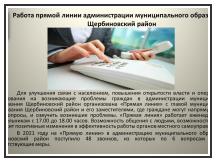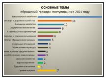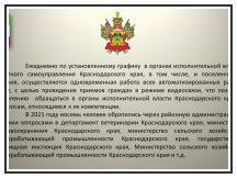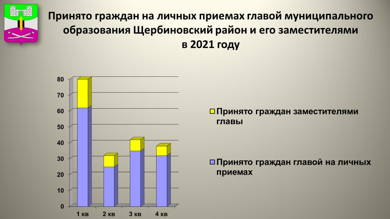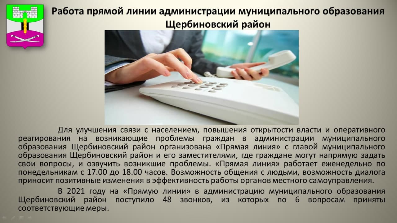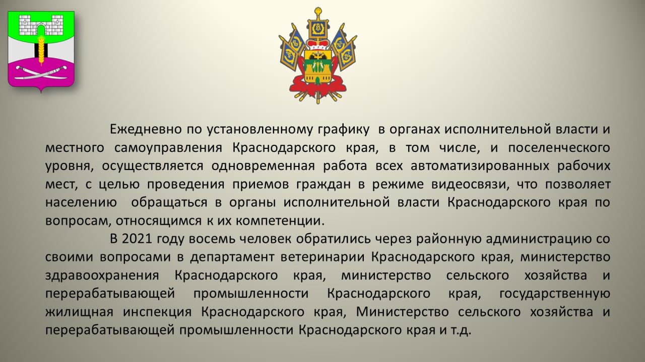 306 письменных обращений поступило в администрацию района в 2021 году. Главой, исполняющим полномочия главы района и заместителями главы принято 192 заявителя. 30% обращений были рассмотрены комиссионно, с выездом на место. На телефон «Прямой линии» поступило 48 звонков. 8 жителей района обратились в министерства и департаменты Краснодарского края в режиме видеосвязи. В 2021 году во всех сельских поселениях проведены выездные приёмы граждан. Основные темы обращений граждан в 2021 году- коммунальное хозяйство,транспорт и дорожное хозяйство,жилищное хозяйство и социальное обеспечение.