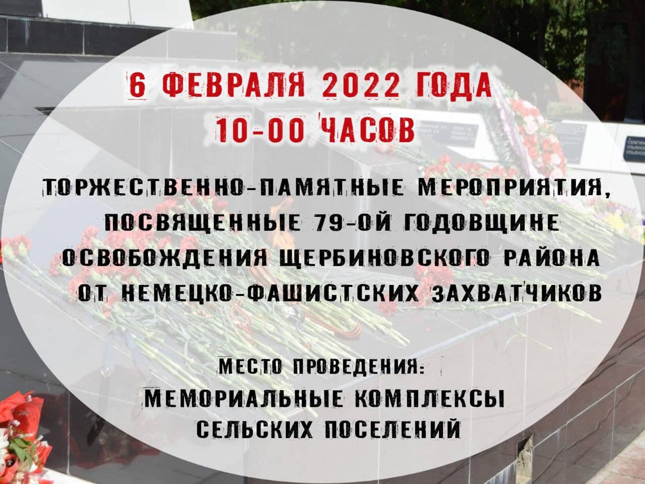 6 февраля в 10.00 во всех сельских поселениях района пройдут торжественно-памятные мероприятия, посвященные 79 – ой годовщине освобождения Щербиновского района от немецко-фашистских захватчиков.
