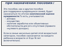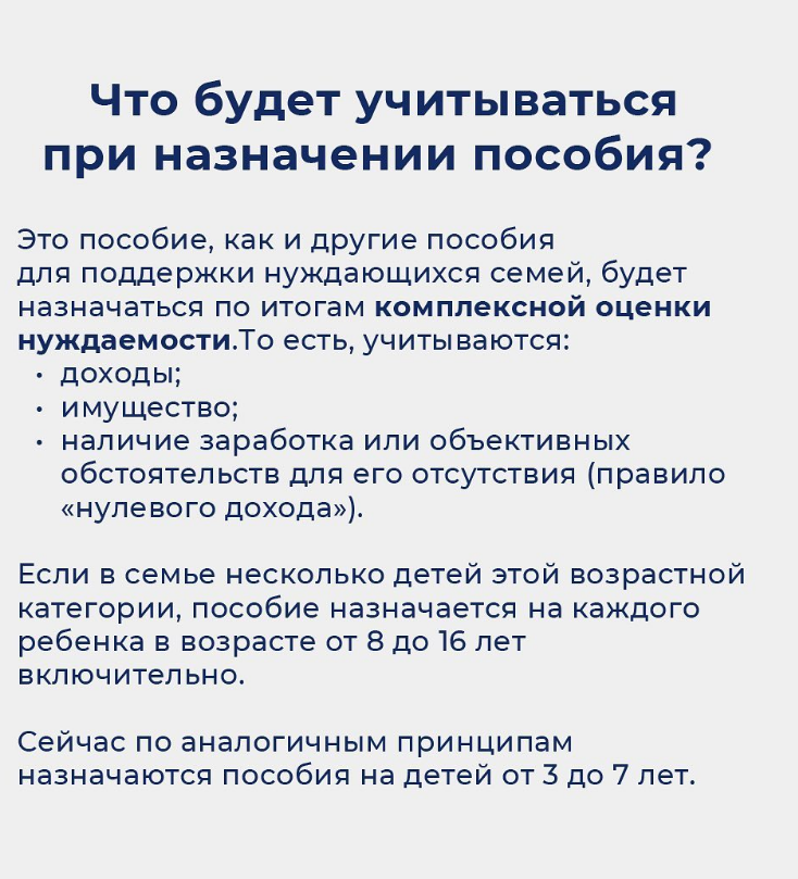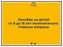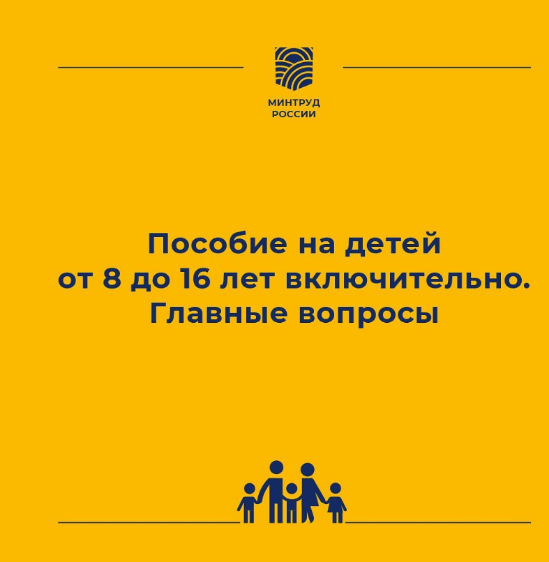 По решению Президента вводится новая мера поддержки для семей с невысокими доходами - ежемесячное пособие на детей от 8 до 16 лет включительно. Такое пособие назначается семьям, чей среднедушевой доход - ниже прожиточного минимума. Ответы на главные вопросы о новом пособии в карточках Минтруд России