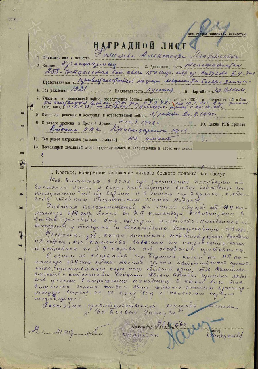 Из наградного листа от 31 мая 1945 года: «Каменева Александра Леонтьевна, звание – красноармеец; должность – телефонистка, 258 отдельного бат. связи 150 стр. Идр. ор. Кутузова II ст. див. Представляется к Правительственной награде медали «За боевые заслуги»; год рождения – 1921; национальность – русская… Тов. Каменева, в боях при расширении плацдарма на Западном берегу р. Одер, последующих боевых действиях при наступлении на гор. Берлин и в самом гор. Берлине, показала себя стойким защитником нашей Родины. Работая телефонисткой на линии, идущей от КП командира 674 стр. полка до КП командира дивизии, она в любых условиях боя, презирая опасность, находилась на дежурстве у телефона и обеспечивала бесперебойную связь. Несколько раз, когда линейные надсмотрщики выходили из строя, тов. Каменева выбегала на исправление линии и устраняла по 3-4 порыва под обстрелом противника. В одном из кварталов гор. Берлина, когда на КП командира 674 стр. полка напала группа автоматчиков противника, просочившаяся через наш передний край, тов. Каменева вместе с остальными бойцами своего взвода, приняла активное участие в отражении нападения. В этом бою тов. Каменева спасла жизнь двум тяжело раненым красноармейцам, вынесла их из поля боя и оказала первую медпомощь…»