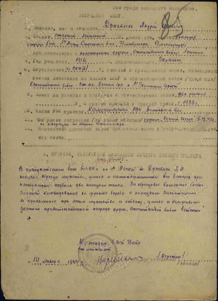 Из наградного листа № 01826: «Дрыгваль Андрей Иванович, звание - старший лейтенант; должность - командир батареи 224 отд. истр. противотан. дивизии 150 стр. Идр. ор. Кутузова II ст. дивиз., представляется к Ордену Красное Знамя. Год рождения - 1916; национальность – украинец… В боях за город Берлин батарея, которой командовал старший лейтенант Дрыгваль в ожесточенных боях… в районе Веддин батарея ведя бой в окружении без содействия пехоты заняла четыре квартала, уничтожила пять станковых пулеметов и 40 гитлеровцев. В боях за Рейхстаг батарея уничтожила четыре 85 м/м зенитных пушки, подавила огонь трех станковых пулеметов и уничтожила 120 гитлеровцев, тем самым батарея обеспечила продвижение нашей пехоты вперед к Рейхстагу…»;