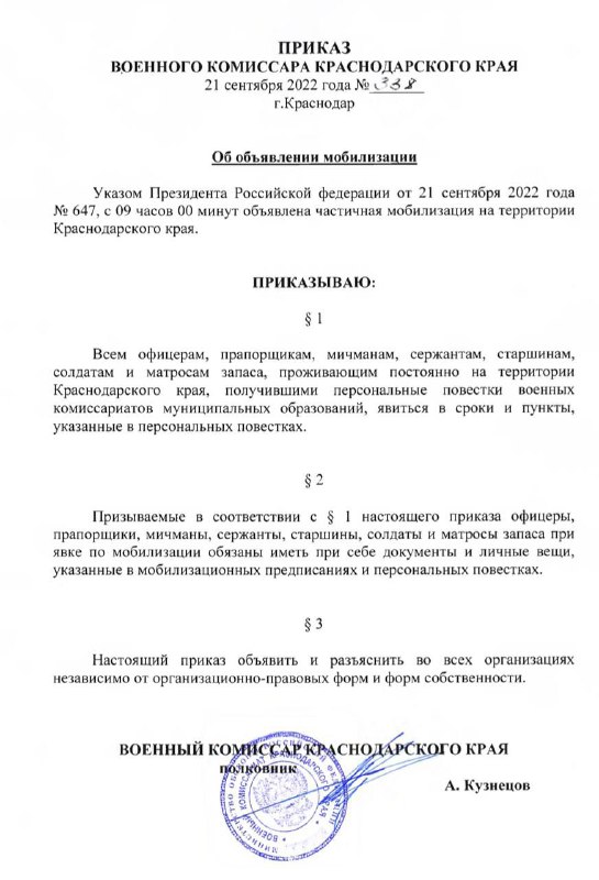 Указом Президента Российской Федерации от «21» сентября 2022 года № 647, с 9 часов 00 минут «21» сентября 2022 года объявлена частичная мобилизация на территории Краснодарского края, ПРИКАЗЫВАЮ: всем офицерам, прапорщикам, мичманам, сержантам, старшинам, солдатам и матросам запаса, проживающим постоянно на территории Щербиновского района, имеющим мобилизационные предписания или получившим персональные повестки военного комиссариата Ейского и Щербиновского муниципальных районов, явиться в сроки и пункты, указанные в мобилизационных предписаниях.