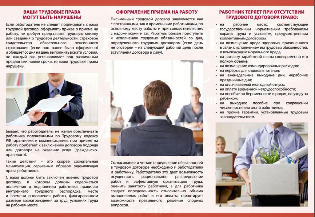 Ваши трудовые права могут быть нарушены Если работодатель не спешит подписывать с вами трудовой договор, оформлять приказ о приеме на работу, не требует представить трудовую книжку или сведения о трудовой деятельности, страховое свидетельство обязательного пенсионного страхования (если оно ранее было оформлено) и обещает со дня на день выполнить все эти условия, но каждый раз устанавливает под различными предлогами новые сроки, то ваши трудовые права нарушены. Бывает, что работодатель, не желая обеспечивать работника положенными по Трудовому кодексу РФ гарантиями и компенсациями, при приеме на работу прибегает к заключению договора подряда или договора на оказание услуг (гражданско-правового). Такие действия – это скорее сознательная манипуляция, серьезным образом ущемляющая права работников.