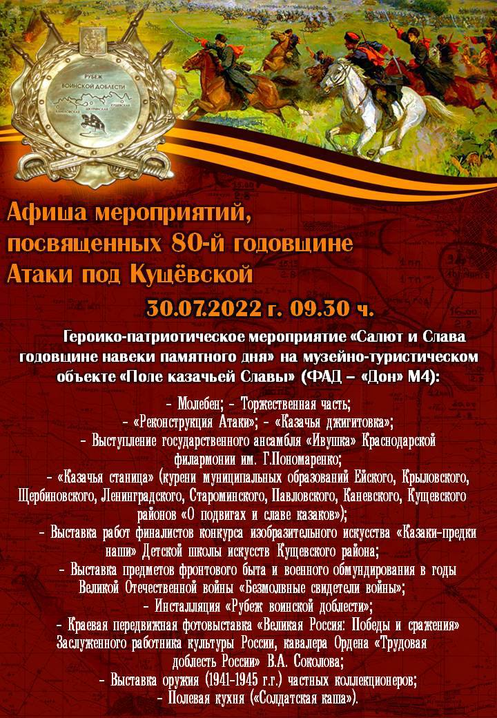 Завтра в станице Кущёвской на музейно-туристическом объекте «Поле казачьей Славы» пройдут мероприятия, посвящённые 80-ой годовщине Атаки под Кущёвской. Уже сегодня делегация района выехала в станицу для установки куреня нашего района «О подвигах и славе казаков».