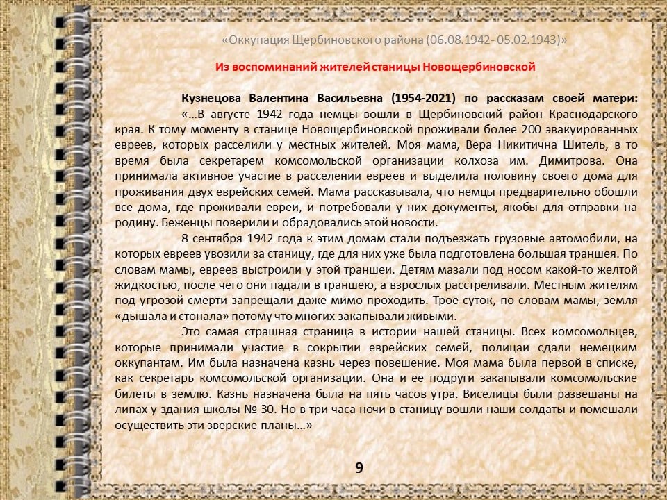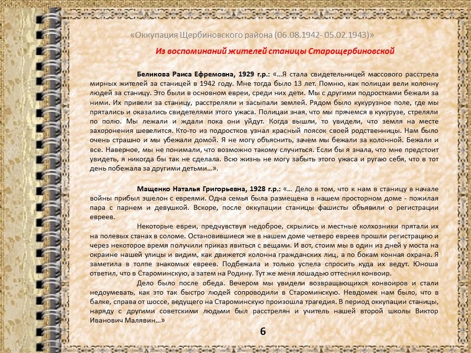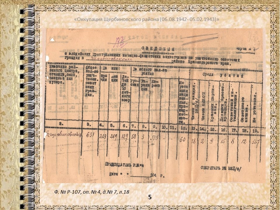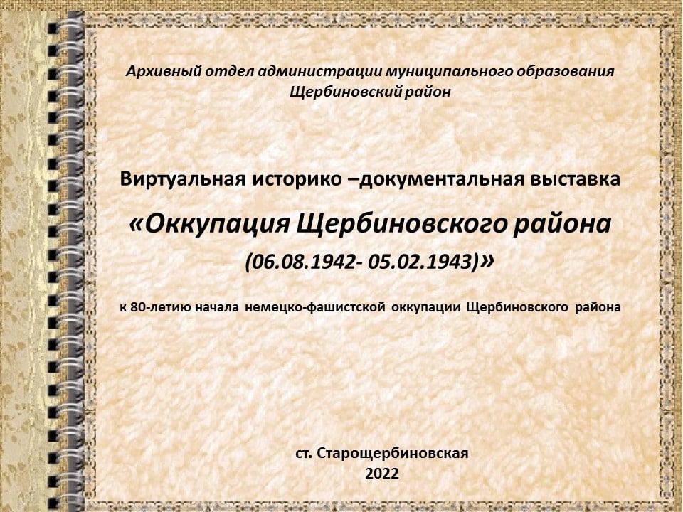 6 августа 1942 года началась оккупация Щербиновского района немецко-фашистскими захватчиками. К этой дате архивный отдел администрации района подготовил виртуальную выставку.