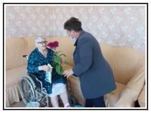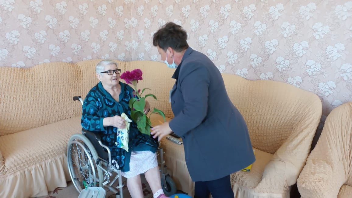 Члены участковой избирательной комиссии избирательного участка № 57-13 приехали к юбилярше домой. Преподнесли ей цветы и подарок.