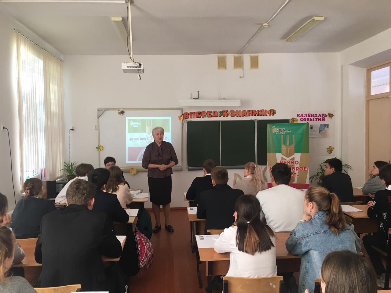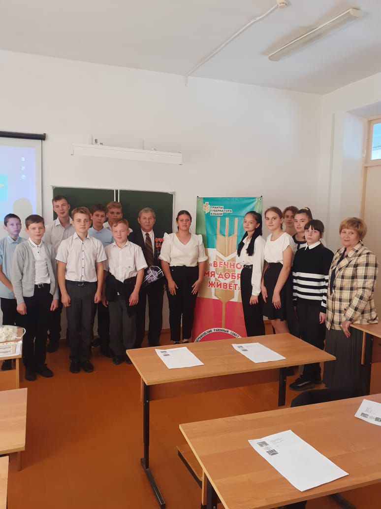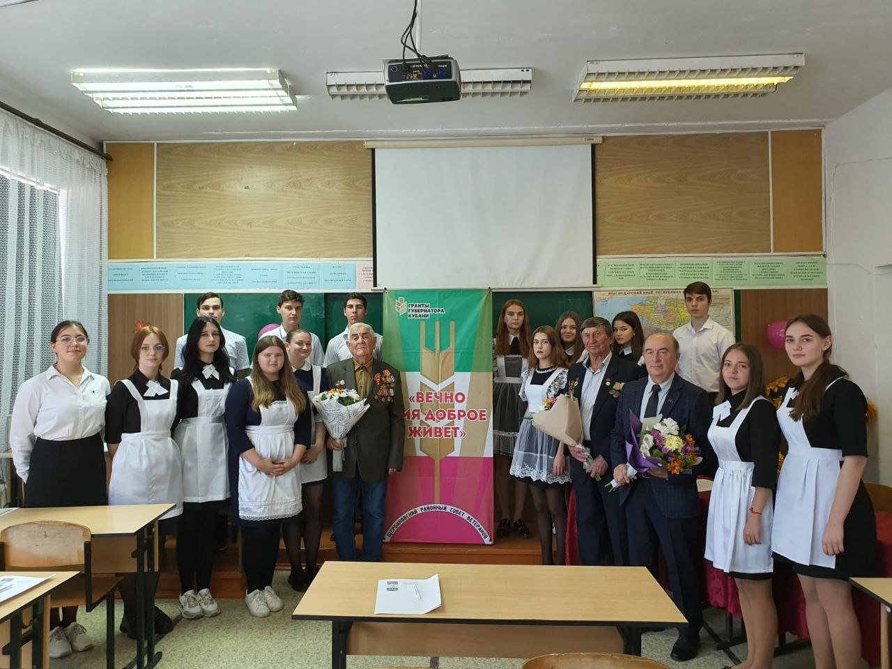 Щербиновский районный совет ветеранов успешно продолжает реализацию социально полезного проекта «Вечно имя доброе живет» на грант губернатора Кубани. 14 октября 2022 года прошли Уроки Славы в 5-11 классах в средних школах района: №6 имени А.А. Шукалова, №7 имени Г.Т.Ткаченко, №8 имени П.И.Кочерга. Продолжился важный разговор ветеранов со школьниками о судьбах земляков, которые ради мирной жизни, ради созидательного труда совершали подвиги, о том, что в полной мере мы все можем и должны гордиться не только боевыми орденами и медалями, но и наградами за мирный, не менее доблестный труд. Любовь к своей стране невозможна без любви к своей малой родине. Село Екатериновка замечательный уголок Краснодарского края. На глазах хорошеет село с каждым днем. Ушли в прошлое хаты-мазанки, появились асфальтированные улицы с новыми кирпичными домами, новый офис врача общей практики, Дом культуры и школа в центре села. Это малая родина Кряжова Михаила Николаевича, председателя районного совета депутатов, председателя районного совета ветеранов, руководителя проекта «Вечно имя доброе живет. Родная земля! Отчий край ! Отец его, Кряжов Николай Архипович, фронтовик, награжден медалью «За Отвагу», орденом Отечественной войны 2 степени. Трудовая деятельность, а это 50 лет, прошла в колхозе имени Шевченко: тракторист, механик, бригадир садоводческой бригады. Его добросовестное служение родной земле, землякам на всю жизнь стало примером для Михаила Николаевича, его трудовая деятельность - служение людям района. Для него встреча со старшеклассниками в родной школе была по-особому важной. Особая гордость для Михаила Николаевича – его земляки. Рядом с ним почетные хлеборобы села Дейнега Виктор Евгеньевич, Гащенко Виктор Павлович - о них его рассказ.