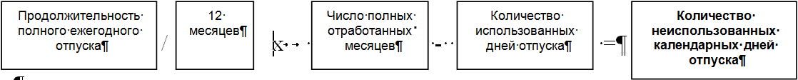 Продолжительность полного ежегодного отпуска 12 месяцев Число полных отработанных месяцев Количество использованных дней отпуска Количество неиспользованных календарных дней отпуска