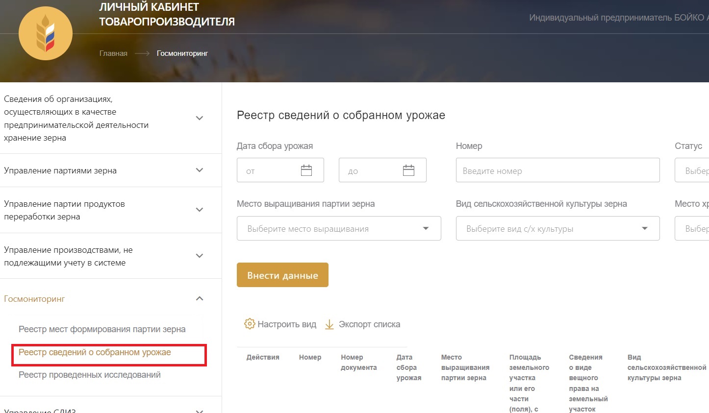 - слева панель -> Кнопка «Госмониторинг» -> вкладка «Реестр сведений о собранном урожае» -> кнопка «Внести данные» ->Заполняете форму (см. второе изображение)