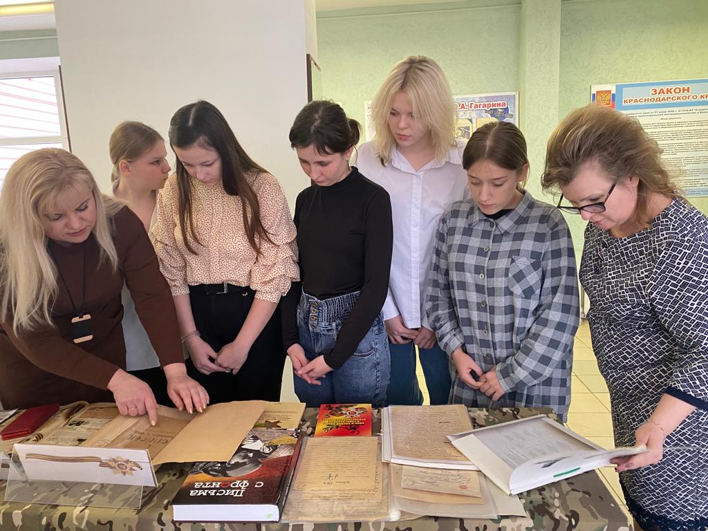 Архивным отделом администрации района для студентов Щербиновского индустриального техникума проведена выездная выставка «Не забудем подвиг земляков», к 80-летию освобождения Щербиновского района от немецко-фашистской оккупации». На выставке были представлены архивные документы из фонда «Коллекция документов по истории Щербиновского района»: письма с фронта 1943 года, фотографии событий периода оккупации района, акты расстрелов и ущерба, книги из справочно-информационного фонда по теме «Великая Отечественная война», воспоминания свидетелей массовых расстрелов мирных жителей, газетные публикации о щербиновцах – жителях оккупированного района, участниках Великой Отечественной войны 1941-1945 гг.