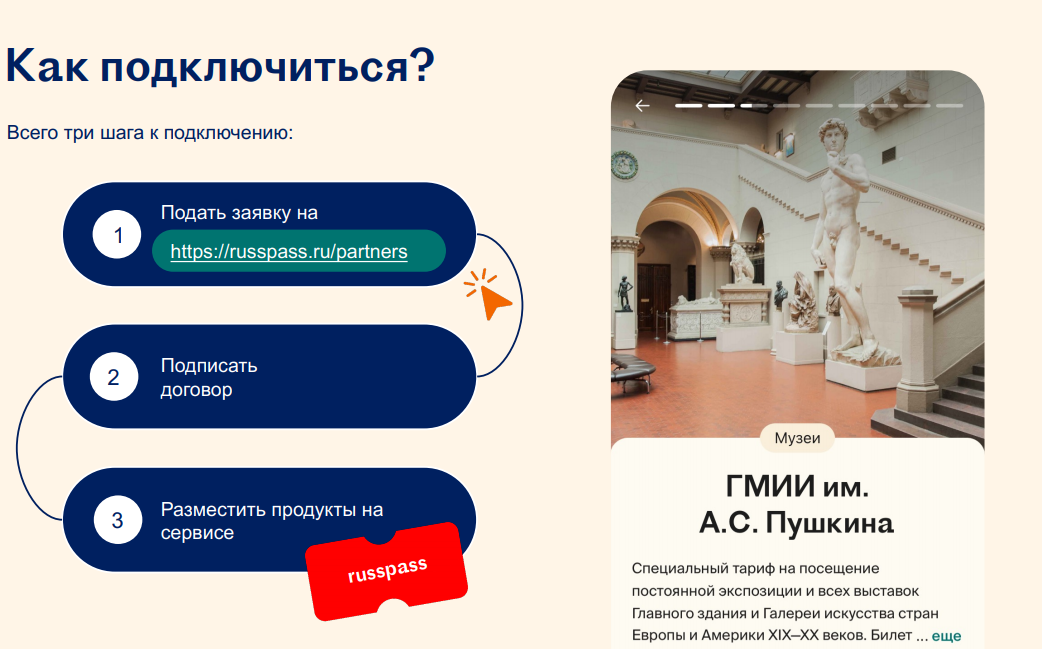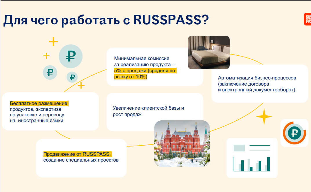 С целью расширения перечня приобретаемых пользователями продуктов и услуг, а также для наращивания туристического потенциала субъектов Российской Федерации к сотрудничеству с RUSSPASS приглашаются гостиницы, рестораны музеи и другие объекты показа.