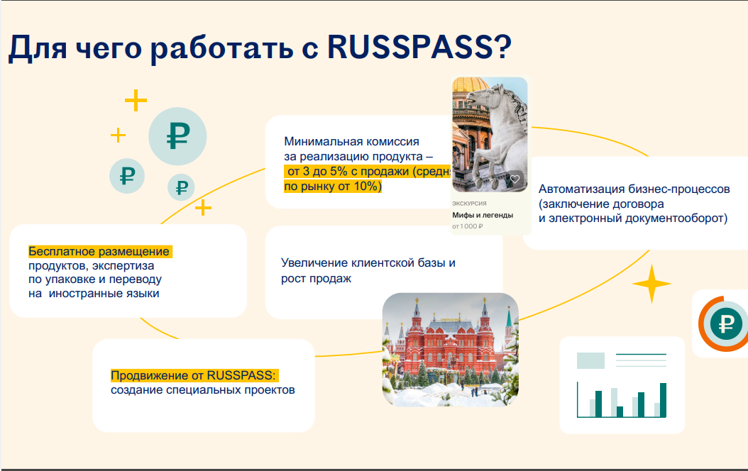 Подключение к RUSSPASS является бесплатным, а для партнеров установлена минимальная комиссия от 3 до 5% от суммы продажи (в среднем по рынку от 15 до 35%). При этом RUSSPASS оказывает помощь партнерам от упаковки контента до организации совместных проектов между разными участниками отрасли.