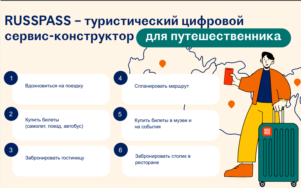 В рамках работы RUSSPASS для туриста предусмотрена возможность формирования индивидуального событийного плана: покупка билетов на транспорт, в музеи, бронирование гостиниц и ресторанов, маршруты и экскурсии.
