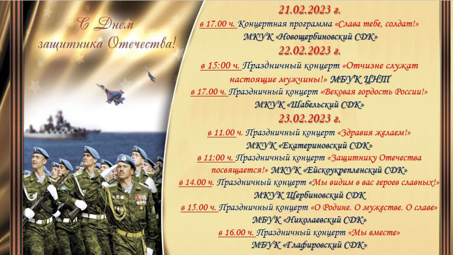 Приглашаем жителей района на праздничные концерты, посвящённые Дню защитника Отечества