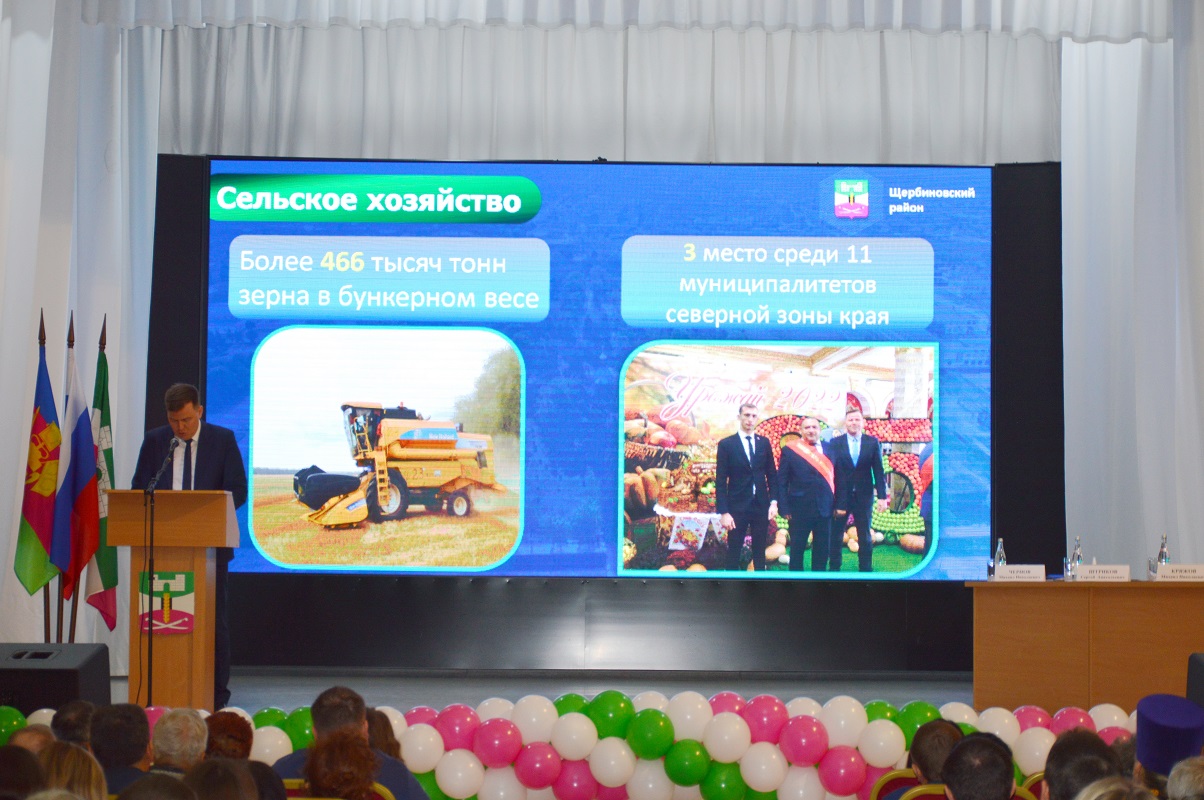 Особого внимания заслуживает сельское хозяйство, являющееся базовой отраслью экономики района. Аграрии района получили наивысший урожай за всю историю нашего муниципалитета - более 466 тысяч тонн зерна в бункерном весе. Щербиновский район занял 3 место среди 11 муниципалитетов северной зоны края. Предприятиями агропромышленного комплекса в 2022 году уплачено налогов в различные уровни бюджетов 1 млрд. 436 миллионов рублей, что выше уровня предыдущего года на 37 процентов.Средняя урожайность озимой пшеницы в районе составила 70,3 ц/га, что выше уровня прошлого года на 12 ц/га. Что же касается жилищно-коммунальной сферы, то на территории района продолжается реализация поручения Президента Российской Федерации по организации работы по обеспечению подвода газа до границ негазифицированных домовладений. На сегодняшний день жителями подано 217 заявок на догазификацию, заключено 179 договоров, к ста тридцати девяти домовладениям подведен газ до границы земельного участка, а 73 домовладения уже полностью газифицированы. В отчетном году приобретено 186 контейнеров для раздельного накопления твердых коммунальных отходов. По программе капитального ремонта многоквартирных домов выполнен плановый капитальный ремонт 1 многоквартирного дома, в планах на этот год - ремонт еще 3 многоквартирных домов в станице Старощербиновской на общую сумму 11 миллионов рублей.
