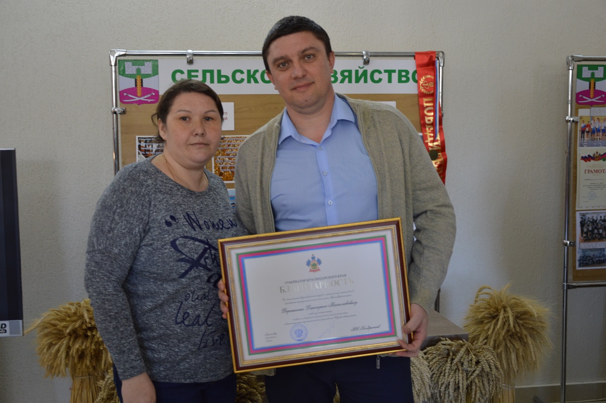 За выдающийся вклад в развитие Краснодарского края медалью III степени награжден Михаил Чернов.За многолетний добросовестный труд, выдающиеся заслуги в области ветеринарии и большой личный вклад в развитие агропромышленного комплекса Краснодарского края почетное звание «Заслуженный ветеринарный врач Кубани» присвоено Геращенко Юлии, заведующей Екатериновским ветеринарным участком. За большой личный вклад в социально-экономическое развитие Краснодарского края и личный вклад в развитие агропромышленного комплекса Краснодарского края Сергей Штриков и Михаил Чернов вручили жителям Почётные грамоты администрации края и Благодарности Губернатора Краснодарского края.