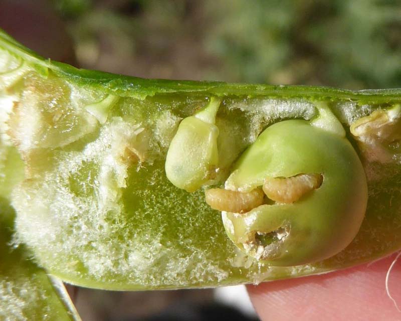 Гороховая зерновка – один из опаснейших вредителей гороха. До цветения гороха жуки питаются различными цветущими растениями, с началом цветения перелетают на горох, где питаются пыльцой. С появлением молодых бобов жуки приступают к откладке яиц. Отродившиеся личинки прогрызают стенку боба, дальнейшее развитие протекает внутри горошины. В результате повреждений снижается масса и качество зерна, теряется всхожесть. Поврежденное зерно становится непригодным для производства высококачественных консервов.