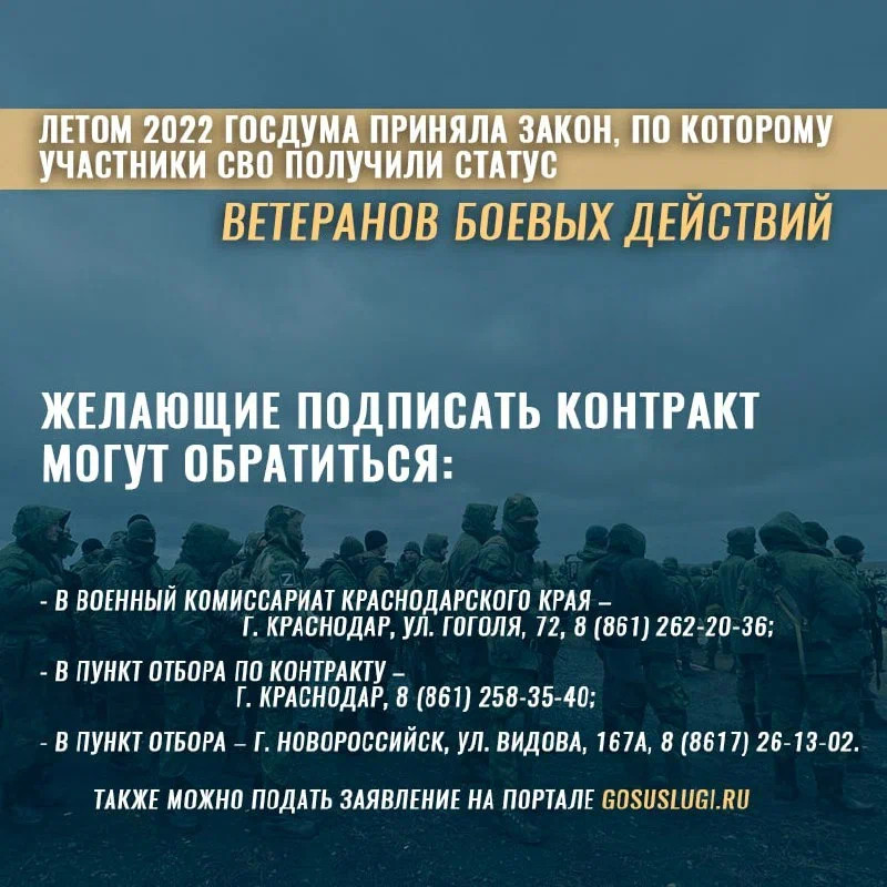 Подробности на сайте Службапоконтракту.рф (https://xn--80aabtwbbuhbiqdxddn.xn--p1ai/), в телеграм-канале Объясняем.рф (https://t.me/obyasnayemrf/7712) и по телефону 117.