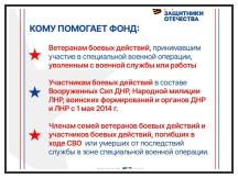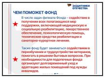 В апреле этого года Указом Президента РФ был создан государственный фонд «Защитники Отечества», цель которого комплексное сопровождение ветеранов спецоперации и членов их семей, а также оказание помощи по разным направлениям социальной и профессиональной жизни. В числе задач филиала Фонда – содействие в получении всех полагающихся мер поддержки, включающей медицинскую и социальную реабилитацию, лекарственное обеспечение, психологическую помощь, технические средства реабилитации и санаторно-курортное лечение. Также он будет заниматься содействием в переобучении и трудоустройстве ветеранов, помогать в решении бытовых вопросов. При необходимости для подопечных фонда организуют долговременный уход и адаптацию жилых помещений под нужды инвалидов. Кроме того, среди задач и вовлечение ветеранов СВО в общественные проекты, направленные на патриотическое воспитание граждан, сохранение исторической памяти и укрепление традиционных российских духовно-нравственных ценностей. Также Фонд «Защитники Отечества» будет содействовать некоммерческим и волонтерским организациям, которые помогают ветеранам СВО и членам их семей. Более подробную информацию вы можете узнать по телефону: 8(86132) 2-16-05.