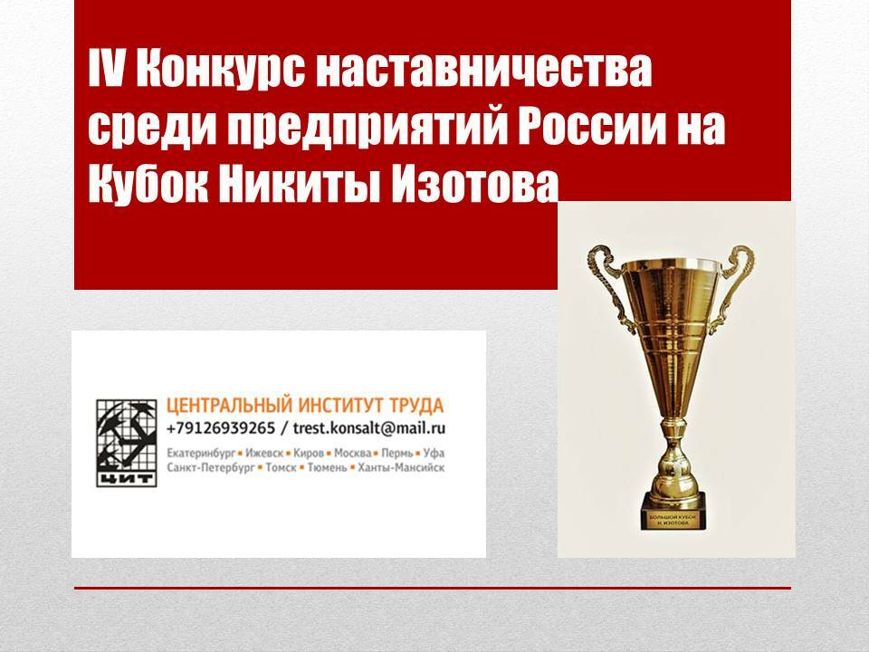 - Конкурс наставничества среди предприятий России на "Кубок Никиты Изотова" по следующим номинациям: "Лучшая система наставничества среди предприятий России – Большой Кубок Никиты Изотова"; "Лучший наставник – Малый Кубок Никиты Изотова", "Лучший пакет нормативных документов по наставничеству – Малый Кубок Никиты Изотова"; "Лучшая команда наставников-напарников России – Кубок "Центрального института труда".
