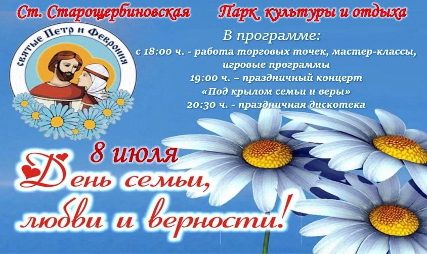 Уважаемые жители района, приглашаем всех вас 8 июля в 19.00 на праздничный концерт, посвящённый прекрасному празднику - Дню семьи, любви и верности. Концерт пройдёт на летней эстраде в парке культуры и отдыха станицы Старощербиновской. Также вечером в парке будут работать различные тематические площадки, будут оформлены фотозоны. Наши артисты подготовили замечательные творческие номера, приходите, ждем вас!