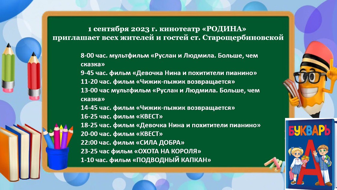 Завтра мы с вами отметим замечательный праздник — День знаний! В этом году за парты сядут 3609 школьников, из них 332 первоклассника! Чтобы сделать первый учебный день ярче, интереснее и насыщеннее для школьников подготовили различные праздничные мероприятия. В парке аттракционов с 10.00 для детей будут различные игровые программы, в 11.00 в Центре народного творчества станицы Старощербиновской состоится торжественное посвящение школьников в ряды юнармейцев, ну а вечером всех приглашаем на танцы! Также все сельские Дома культуры подготовили для ребят различные праздничные программы.