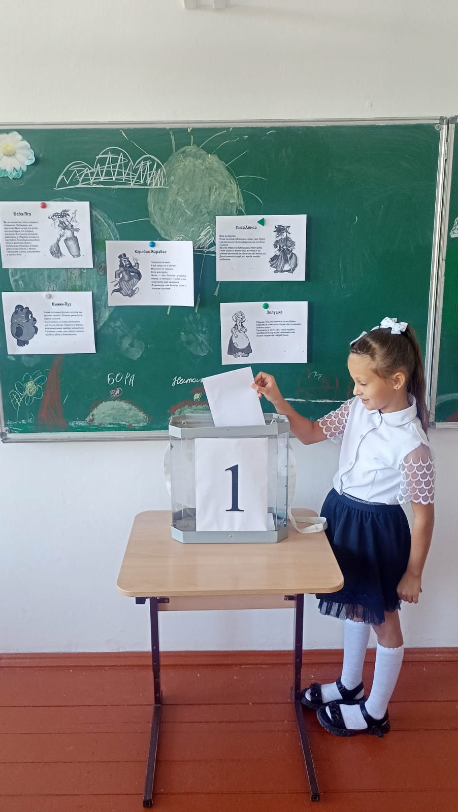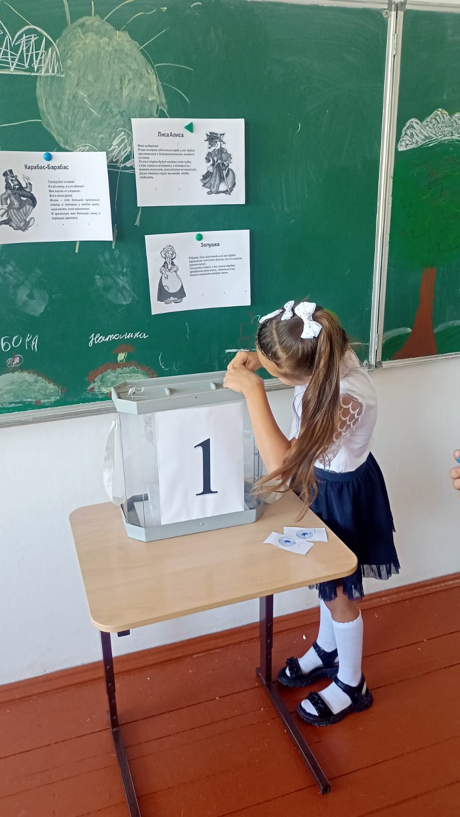 Чтобы лучше объяснить, как работает процедура избрания, для младших школьников директор школы, председатель участковой избирательной комиссии избирательного участка № 57-17 Ирина Назаренко провела в форме игры выборы Президента сказочной страны, где кандидатами выступили Карабас-Барабас, Золушка, Лиса Алиса, Баба-яга и Винни-Пух. Для каждого персонажа была предусмотрена собственная предвыборная программа.