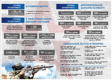 Согласно Указа Президента Российской Федерации военнослужащим, заключившим контракт предусмотрена единовременная денежная выплата в сумме 195 тыс. рублей, в соответствии с Постановлением Губернатора Краснодарского края социальная поддержка в размере 200 тыс. рублей, единовременно. В зоне СВО контрактникам выплачивают денежное довольствие от 204 тыс. рублей, ежемесячно.