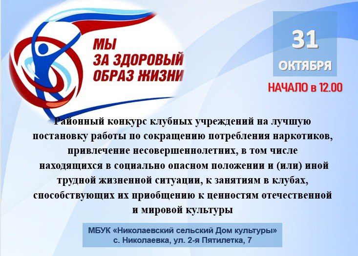 31 октября 2023 г. в Николаевском сельском Доме культуры пройдет районный конкурс клубных учреждений на лучшую постановку работы по сокращению потребления наркотиков, начало мероприятия в 12-00 часов.