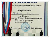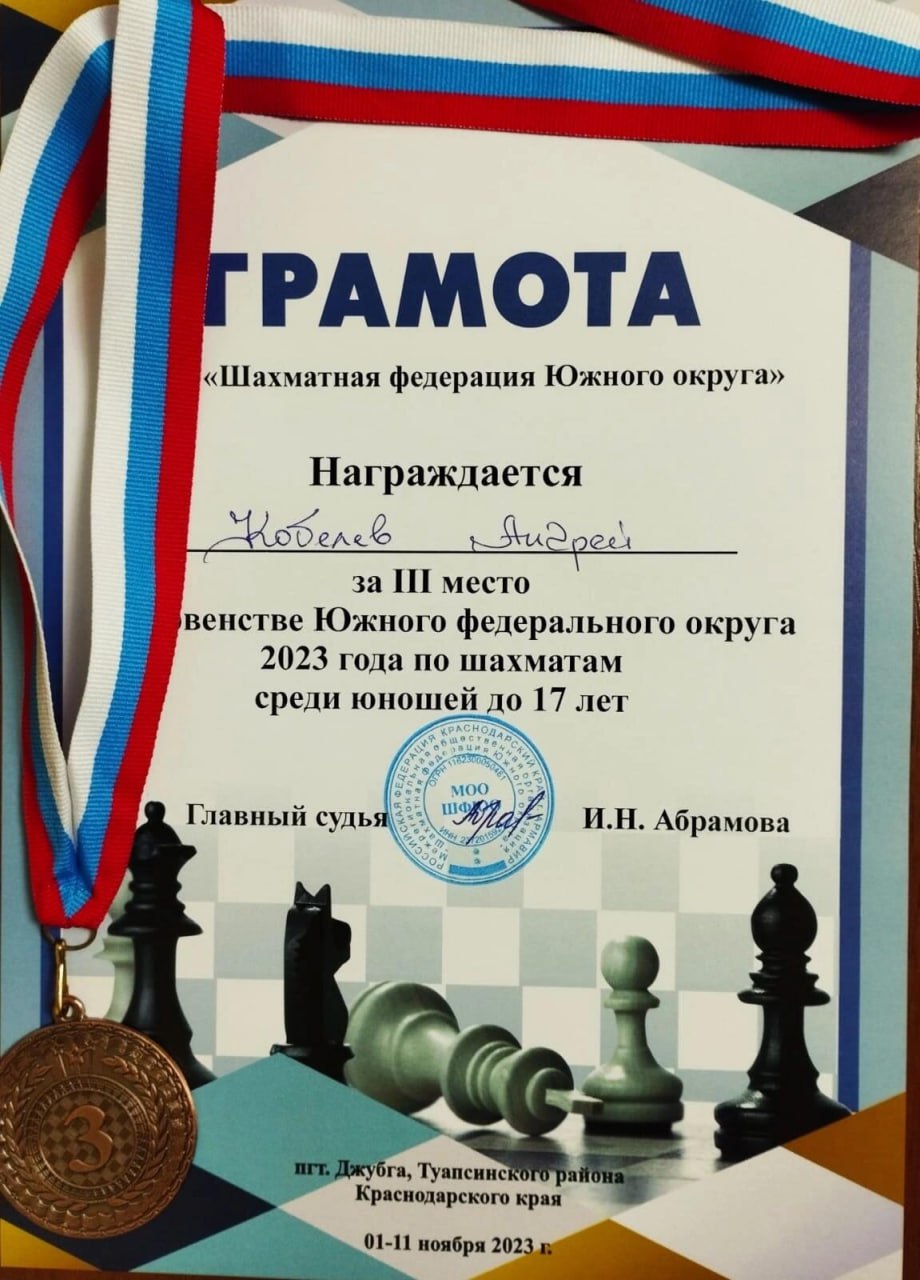 Бронзовую медаль в копилку Краснодарского края принёс воспитанник спортивной школы "Энергия" Андрей Кобелев. Андрей уверенно прошёл дистанцию в девять туров, не проиграв ни одной партии, поделил 1-3 место в общем зачёте и лишь дополнительные показатели вывели на 3 место. Соперниками были представители Краснодарского края, Ростовской области, Астраханской области и Республики Крым. По результатам первенства ЮФО Андрей отобран в Высшую лигу детско-юношеских первенств России, которые пройдут в Екатеринбурге. Поздравляем Андрея и тренера Мальченко Алексея с выходом на первенство России!