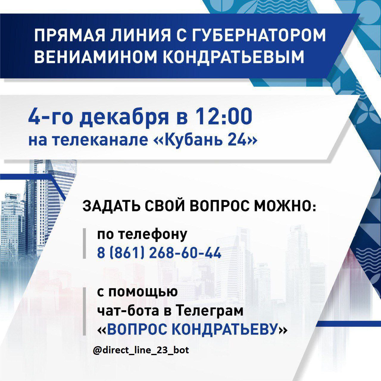 В прямом эфире Вениамин Иванович ответит на вопросы жителей края. В 12:00 на телеканале «Кубань 24» пройдет «Прямая линия». Свои вопросы с завтрашнего дня вы можете задать: через чат-бот в телеграм «Вопрос Кондратьеву» https://t.me/direct_line_23_bot, по многоканальному телефону: 8(861)268-60-44. К своим сообщениям в чат-бот вы можете приложить фото, отправить видео или аудио-вопросы.