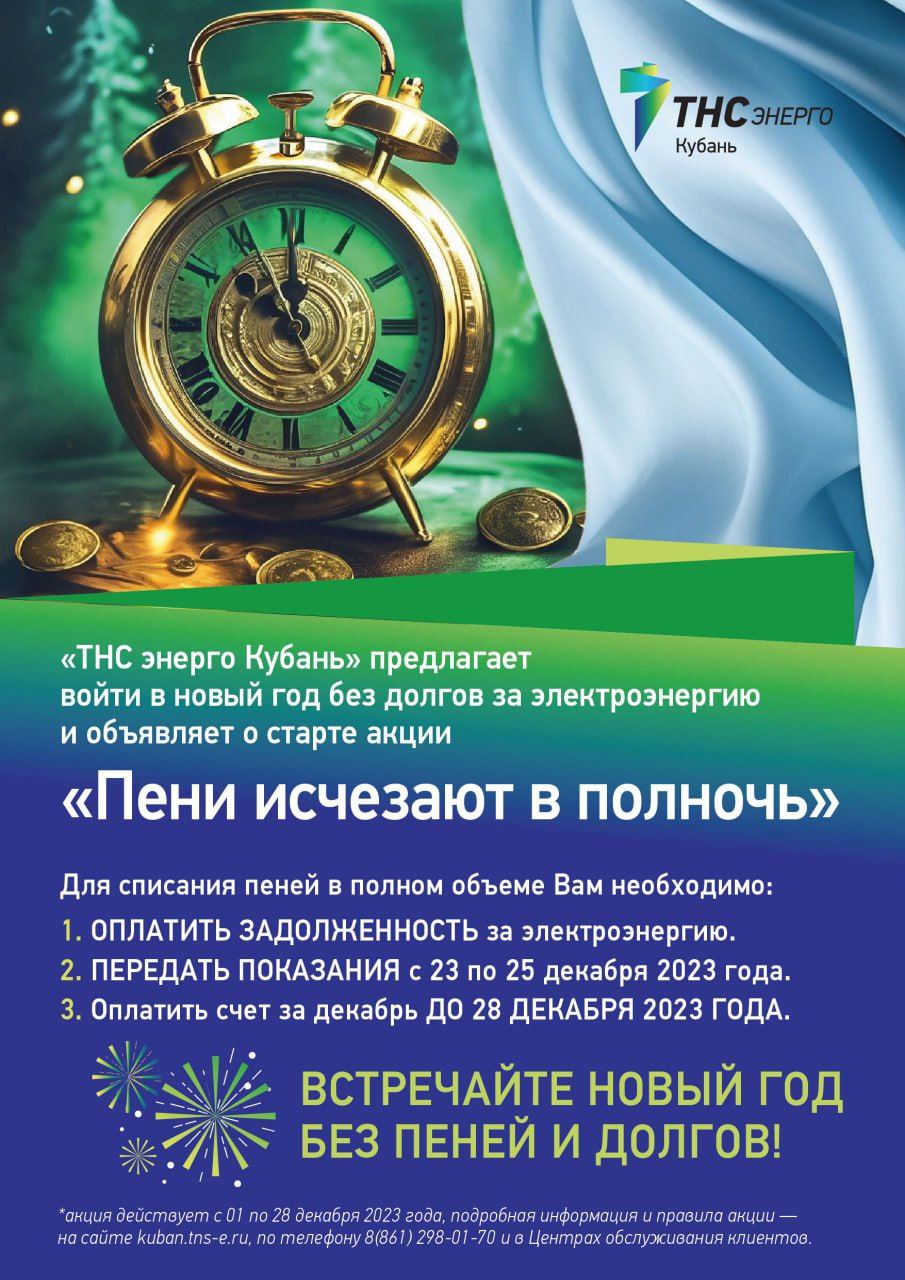 «ТНС энерго Кубань» в рамках акции «Пени исчезают в полночь» аннулирует пени за несвоевременную оплату электроэнергии. Акция продлится с 1 до 28 декабря. За это время абонентам-физическим лицам, у которых накопились пени, необходимо оплатить задолженность за электроэнергию, передать показания с 23 по 25 декабря и оплатить счет за декабрь до 28 декабря. Проще всего это сделать на нашем сайте, в личном кабинете, мобильном приложении, в офисах компании и кассах партнерских организаций. Для оплаты не нужна бумажная квитанция, достаточно знать номер лицевого счета. Итоги акции «Пени исчезают в полночь» будут подведены до 26 января 2024 года. При выполнении всех условий потребители получат квитанции за январь с аннулированными пенями. «ТНС энерго Кубань» рекомендует не задерживать оплату счетов за электроэнергию, чтобы не допустить ограничение подачи ресурса в новогодние каникулы. Возобновить энергоснабжение будет возможно только после полного погашения долга и возмещения расходов на ограничение/возобновление подачи электроэнергии. Соблюдайте традиции – оставляйте долги в старом году, и тогда новый год будет светлым.
