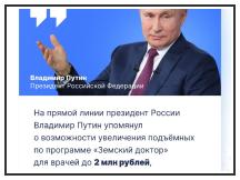 - Владимир Путин предложил повысить подъёмные по программе «Земский доктор»: для врачей - до 2 млн рублей, для фельдшеров - до миллиона.