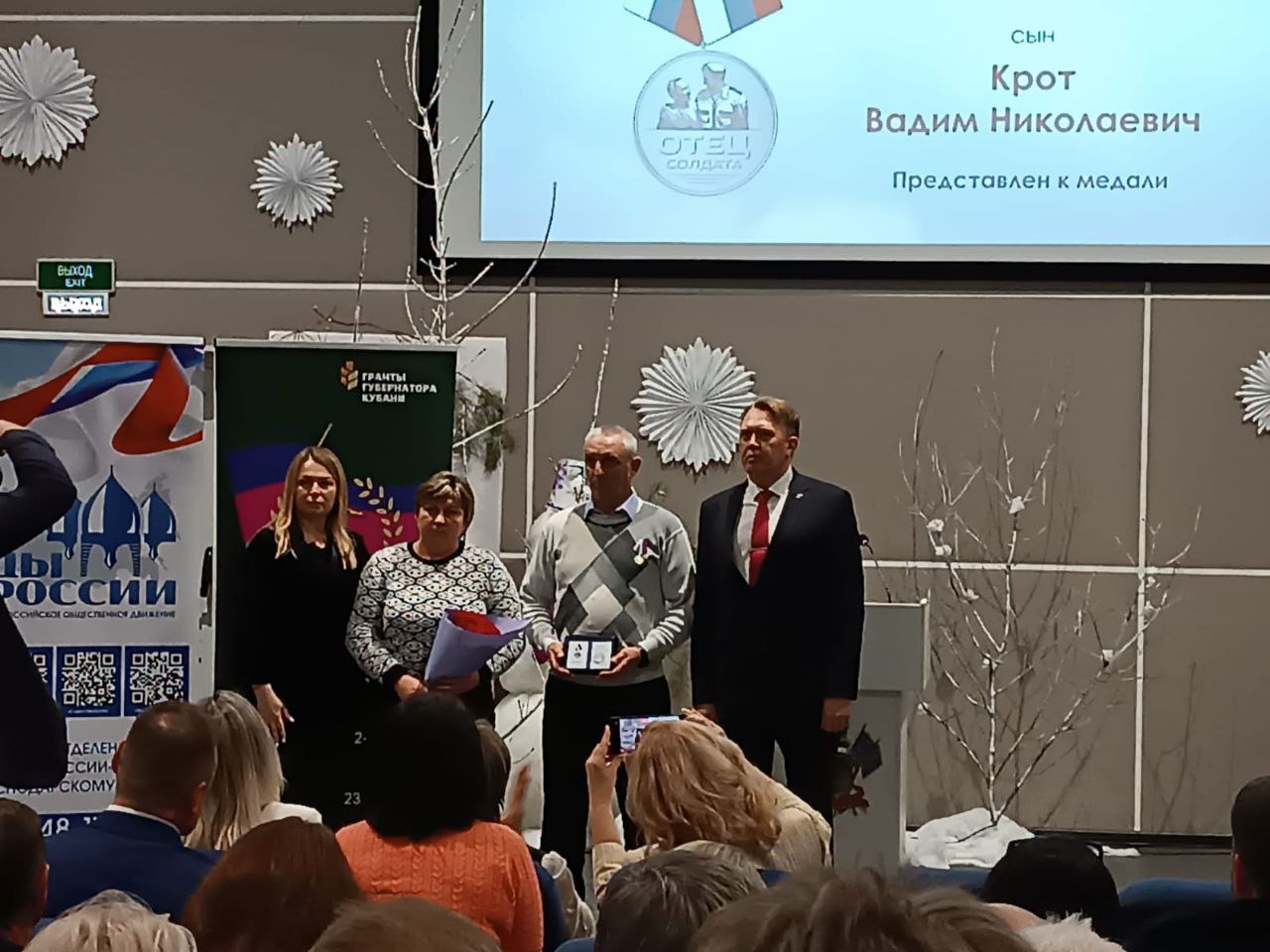 В городе Краснодаре состоялось торжественное мероприятие, посвященное подведению итогов работы штаба Комитета семей воинов Отечества. Трудно переоценить ту благородную миссию, которую выполняет Комитет, ведь работа КСВО направлена на защиту и помощь бойцам и семьям участников СВО. С даты его создания на Кубани принято и отработано свыше 12 тысяч обращений. Такая работа стала практически круглосуточной – сменяя друг друга, волонтёры КСВО собирают обращения от военных, систематизируют задачи и стремятся как можно оперативней выполнить заявку от бойца или его семьи. В этот день были вручены медали «Отец солдата» по инициативе движения «Отцы России» и Комитета семей воинов Отечества. Награду получили отцы военнослужащих, подавших личный пример отваги и мужества, погибших в ходе проведения специальной военной операции: Бурбовский Евгений Леонидович, Крот Николай Николаевич, Белый Сергей Николаевич. Мы помним и гордимся Героями земли щербиновской…