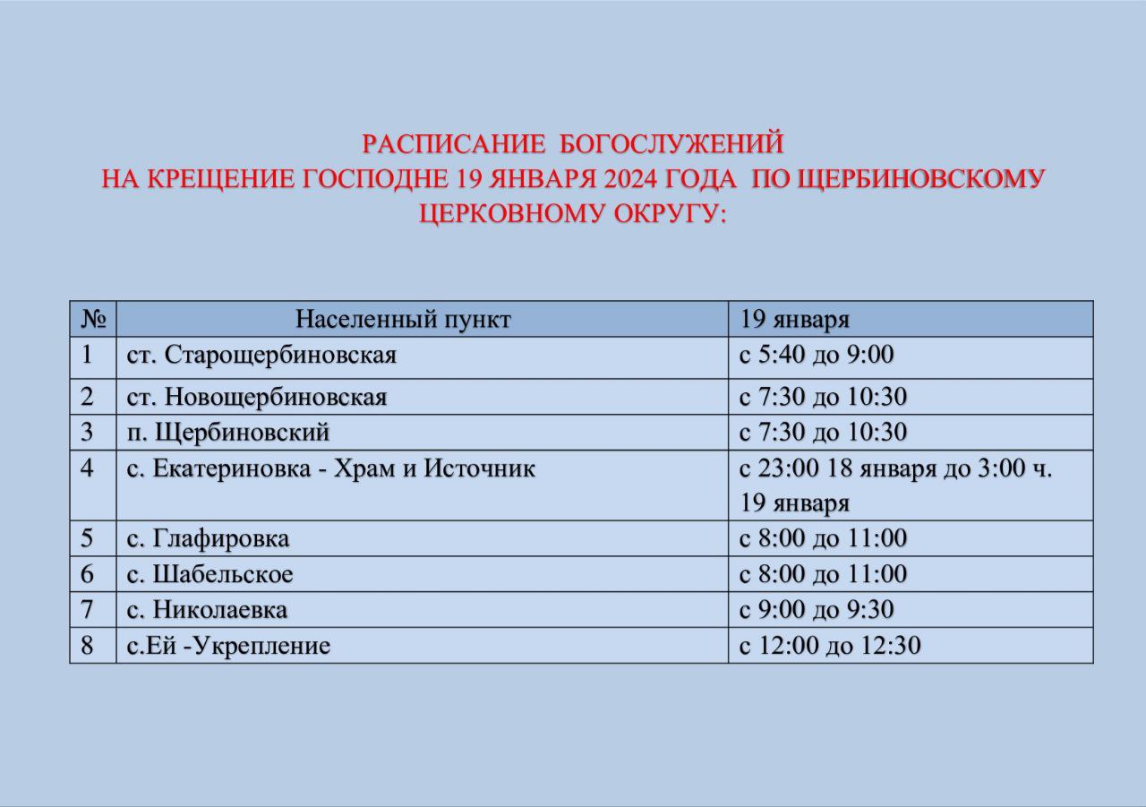Расписание богослужений на Крещение Господне по Щербиновскому церковному округу