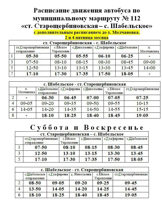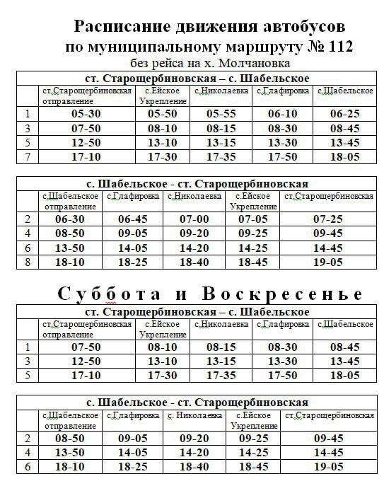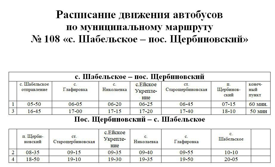 С 22 января на территории муниципалитета движение автобусов по маршрутам городского и пригородного сообщения будет осуществляться по новому расписанию. Также обратите внимание на то, что с 1 января по вашим многочисленным просьбам запустили вновь введенный маршрут пригородного сообщения № 108 «с. Шабельское – пос. Щербиновский». Сохраните себе расписание