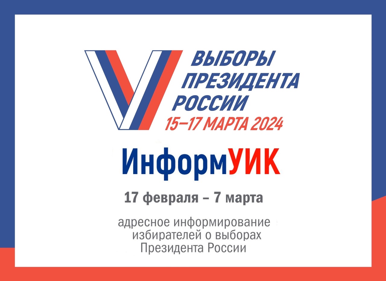 В рамках реализации проекта «ИнформУИК» в период с 17 февраля по 7 марта 2024 года планируется проведение участковыми избирательными комиссиями адресного информирования и оповещения избирателей о сроках, времени и месте, а также о формах голосования на выборах Президента Российской Федерации.