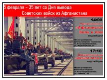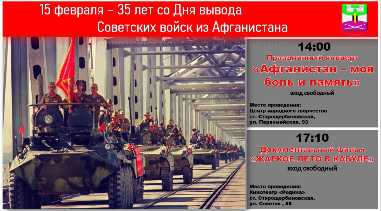 15 февраля - 35-ая годовщина вывода советских войск из республики Афганистан. Приглашаем всех жителей района на праздничный концерт « Афганистан – моя боль и память» и бесплатный показ документального кинофильма «Жаркое лето в Кабуле», который пройдёт в кинотеатре «Родина».