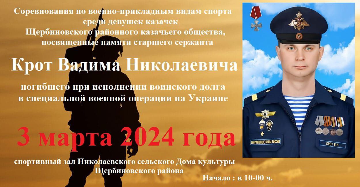 Приглашаем на соревнования по военно - прикладным видам спорта среди девушек казачек, посвященные памяти Вадима Крот, погибшего при исполнении воинского долга в СВО.