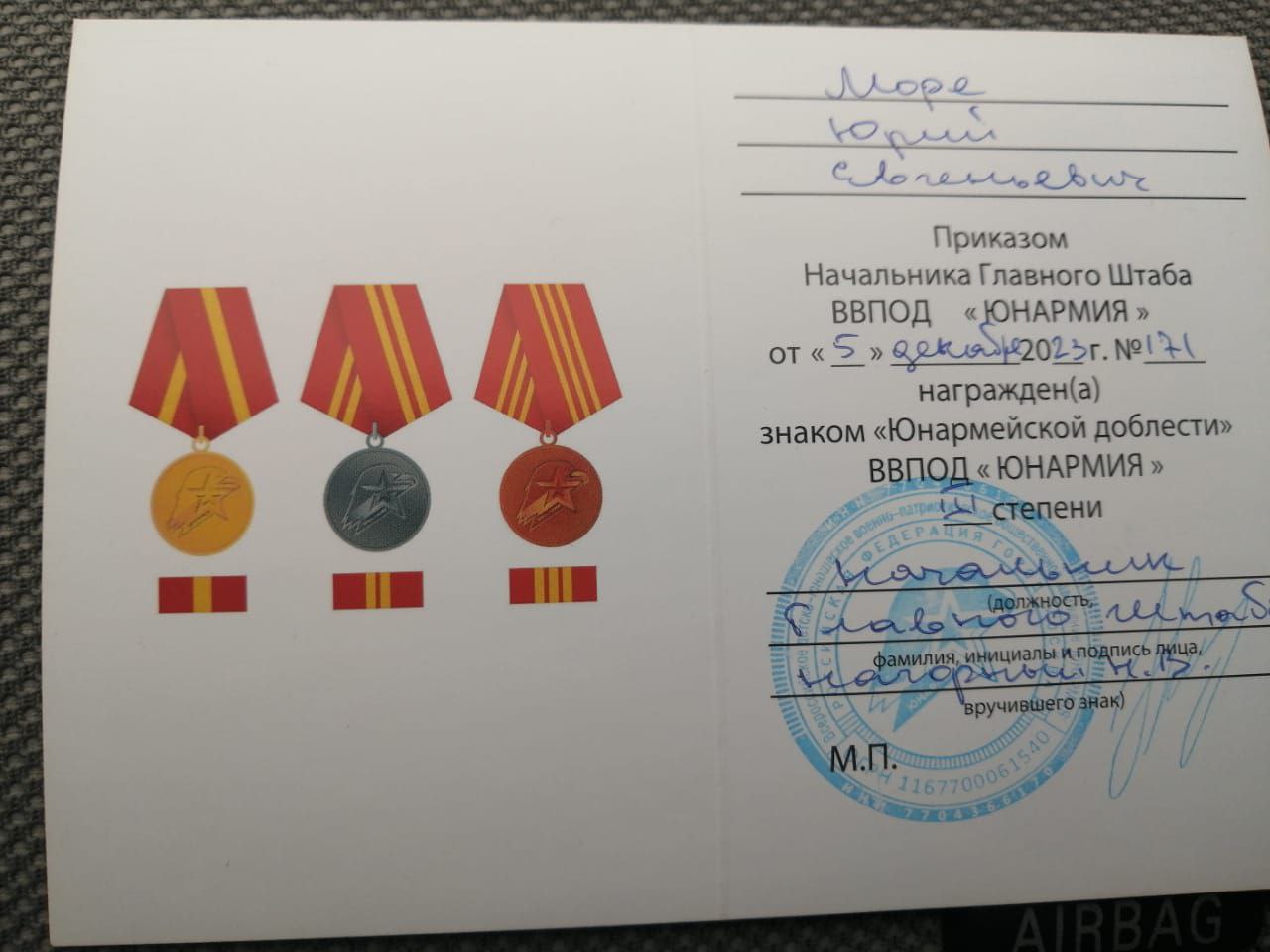 22 марта 2024 года прошла торжественная церемония награждения с вручением нагрудных знаков отличия "Юнармейская доблесть" в станице Платнировской Кореновского района. Чтобы поздравить ребят, собрались их родители, наставники и почётные гости, среди которых Герой Советского Союза Григорий Павлович Хаустов, начальник Регионального Штаба ЮНАРМИИ Краснодарского края Николай Капранов, секретарь комитета по военным вопросам, общественной безопасности, воспитанию допризывной молодёжи и делам казачества Законодательного собрания Краснодарского края Владислав Граф-Колесник. Знаки «Юнармейская доблесть» различной степени были вручены юнармейцам за активное участие в работе организации, победы в спортивных соревнованиях и олимпиадах, высокие результаты в военно-спортивной подготовке, учёбе и общественной жизни. С Щербиновского района нагрудные знаки получили юнармейцы МБОУ СОШ 2 им. П. И. Арчакова: Море Юрий Евгеньевич и Никитянский Егор Алексеевич. Поздравляем наших ребят!