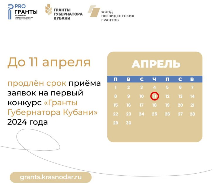 Приём заявок на первый конкурс «Гранты Губернатора Кубани» 2024 года продлён до 11 апреля